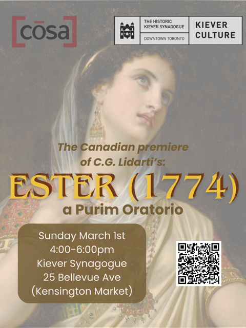 COSA Canada and the Kiever Synagogue are proud to present the Canadian premiere of ESTER (1774) A Purim Oratorio. Presented in Hebrew with English text provided.
